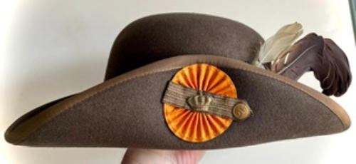 Hoed van een jachtopzichter van paleis het Loo.(eigen collectie)op de knoop de J van Juliana ( 1948-1980 )