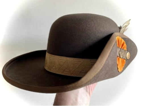 Hoed van het Loo.(eigen collectie)Vermoedelijk van een jachtopzichter. maker D. Adamse, Apeldoorn.op de knoop de J van Juliana ( 1948-1980 )Met goedkleurig W band rond de hoed.Meer info over deze hoed is welkom!