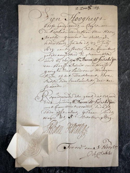 Brief van stadhouder Willem 3 uit 1679, met handtekening en zegel.