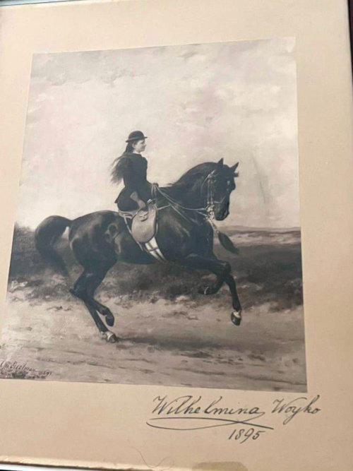 Wilhelmina op haar paard Woyko, gesigneerd door Wilhelmina ( 15 jaar )