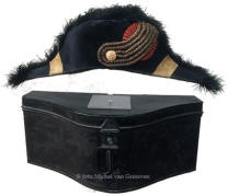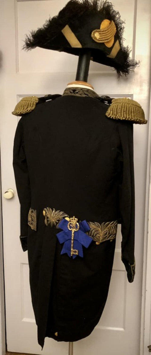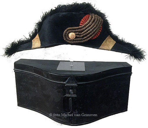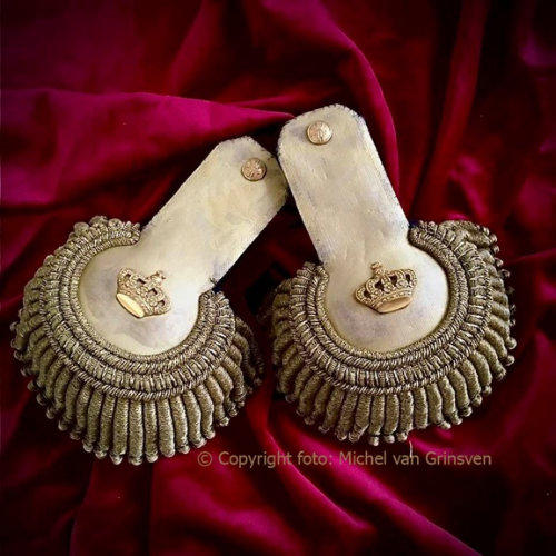 Schouderstukken van het ambtskostuum voor een kamerheer.De kostuums waren er in klein tenue en groot tenue.Op beiden werden deze schouderstukken gedragen.(eigen collectie)Steken van een kamerheer, 1898 - 1948 ( eigen collectie )Boven: klein tenue. Compleet met metalen opbergkoffersWilhelmina - groot tenue: 1898-1948, inklapbaar model met kartonnen opbergdoos.Onder Juliana periode 1948 tot de jaren 60 met metalen opbergblik.Foto van een kostuums kamerheer Groot tenue(eigen collectie)