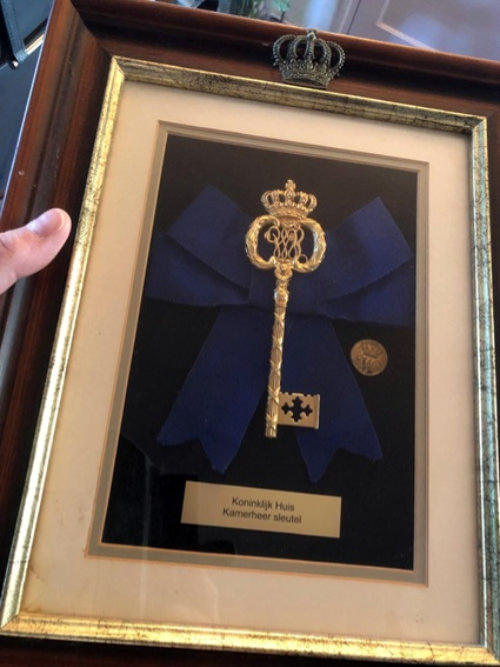 Kamerheersleutel Deze sleutels werden gedragen achterop de heup van het ambtskostuum, op een blauwe strik.Vroeger hadden de kamerheren het vertrouwen van de vorst en konden daadwerkelijk met een sleutel in de privévertrekken komen. Later kreeg de sleuteleen symbolische functie.Links: sleutel uit de Wilhelmina periode in lijst, samen met een knoop van het ambtskostuurm (eigen collectie)