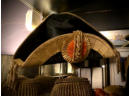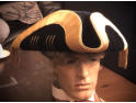 Metalen rozet (eigen collectie)15 cm hoog en in doorsnee 11,5 cmDe rozet lijkt qua uiterlijk op de, kleinere, leren rozet zoals deze worden gedragen op de hoge hoed van een koetsier)Navraag bij iemand die heel lang aan het hof werkte leverde de volgende informatie op:De rozet is van de verouderde versie van het gala tenue van het gala rijtuig waarmee destijds bv. de ambassadeurs werden opgehaald. Aan deze hoed zat ook binnen in de hoed een pruik vast. Later zijn er nieuwere kostuums vervaardigd waarna deze rozet is veranderdDriekanten steek koetsier gala tenue(eigen collectie)