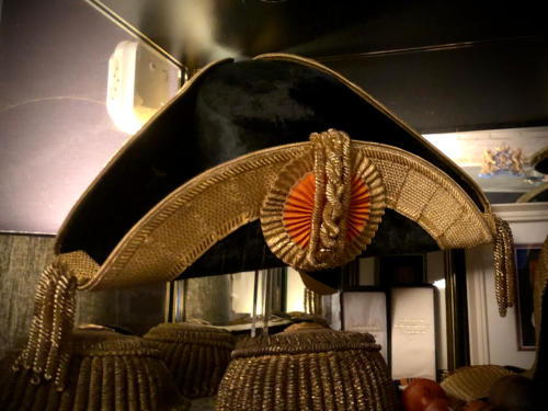 Een stukje galon van het “galon tenue’zoals ook gebruikt wordt op de hoge hoed.Een knoop van een blauwe rokjas van vóór 1907.