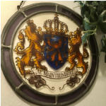 Fantasie uitvoering in glas in lood - model 1815Hier kijken de leeuwen tegen het voorschrift in, richting het schild.Een dergelijike kunstgreep is bij de restauratie ook toegepast op de glazen koets.